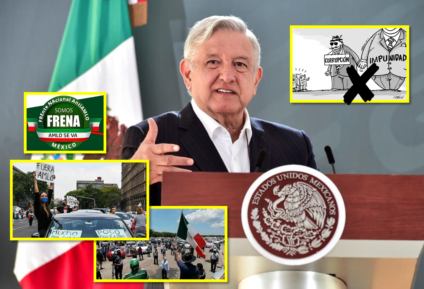 Cabe recordar que en las últimas semanas el partido Frente Nacional Anti AMLO (FRENAAA) ha realizado varias protestas en diferentes estados del país, con el objetivo de que el presidente renuncie a su mandato, irrespetando las medidas de sana distancia por la pandemia de coronavirus que vive México.