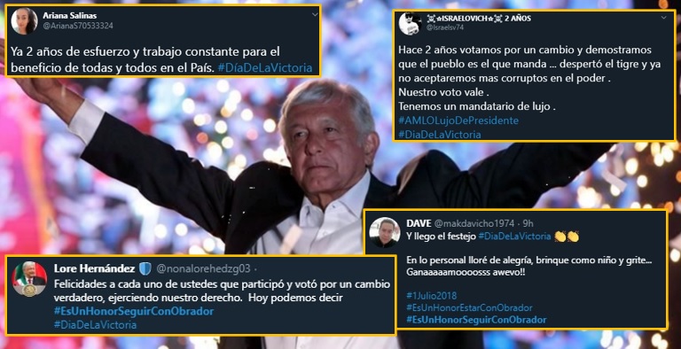 Usuarios de redes sociales celebran lo que llaman el «Día de la Victoria», al recordar que hace dos años, por medio de votos y sobre todo sin violencia, AMLO fue elegido presidente de México.