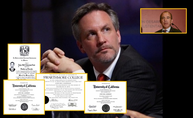 Con fotografías de algunos de sus títulos académicos y parte de su extenso currículum, el Doctor Jonh Ackerman respondió vía redes sociales al ex presidente Felipe Calderón, quien a través de Twitter lo acusó de no contar con ningún documento que acreditara sus estudios y por ello, exigió su renuncia.