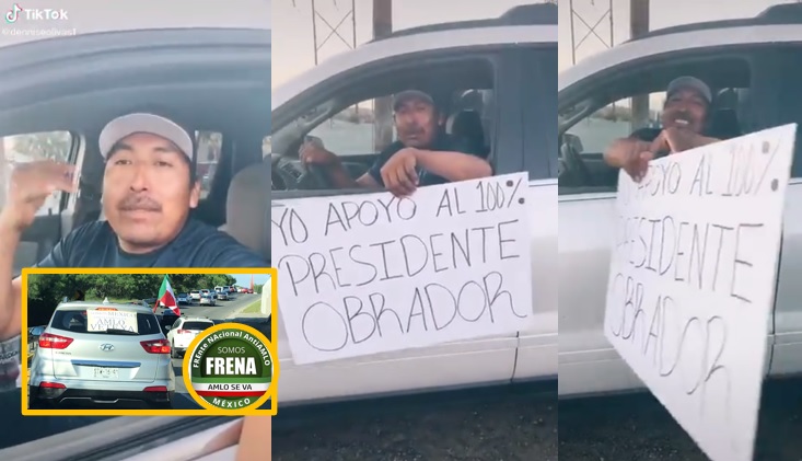 La persona que graba el vídeo le dice que por qué entonces su cartel dice que apoya al cien por ciento al presidente Obrador y el hombre responde con risas que se equivocó y voltea el cartel donde se lee un insulto contra los manifestantes.