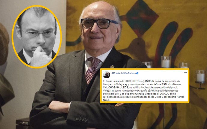 «El haber destapado HACE SIETE(sic) AÑOS la trama de corrupción de Lozoya con Videgaray y la compra de conciencia$ del PAN y los Narco-CHUCHOS/GALILEOS, me valió la implacable persecución del propio Videgaray con el hamponazo oaxaqueño @AristotelesN del entonces putrefacto SAT y de $u$ amanuen$e$ vinculado$ al LAVADO como @Federicoarreola presunto blanqueador de los Zetas y del pedófilo Kamel Nacif…», escribió.