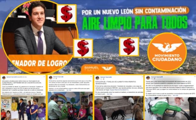 Además de promocionar sus actos altruistas, Samuel García también patrocinó publicaciones con críticas al gobierno federal. Desde los precios de la gasolina, la economía en general, el manejo de la pandemia, por mencionar algunos.