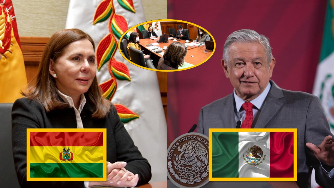 Foto: Twitter oficial Cancillería de Bolivia / AMLO / Bandera – México – Bolivia.