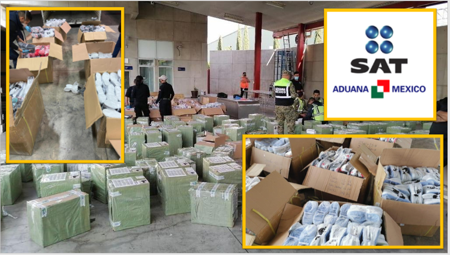 Como parte de las acciones para combatir el flujo de mercancía ilegal en el país, la Administración General de Aduanas, a cargo de Horacio Duarte Olivares, informa del aseguramiento de 6 mil 127 pares de calzado deportivo y 9 mil 600 celulares en la Aduana del Aeropuerto Internacional de la Ciudad de México.