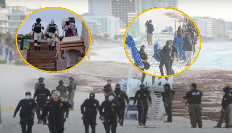 A fin de retirar todo el mobiliario que no correspondía al área pública y liberar el acceso, elementos de la Guardia Nacional, Secretaría de Marina (Semar), Fiscalía General del Estado (FGE), Secretaría de Seguridad Pública y Tránsito del municipio de Benito Juárez, esto en Playa Marlin de Cancún, Quintana Roo.