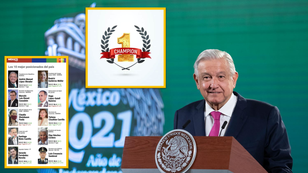 El top el mandatario mexicano, Andrés Manuel López Obrador, con el 61% de aprobación; seguido por su esposa, la doctora Gutiérrez Müller con el 59.4% y el canciller Ebrard también con el 59.1%.