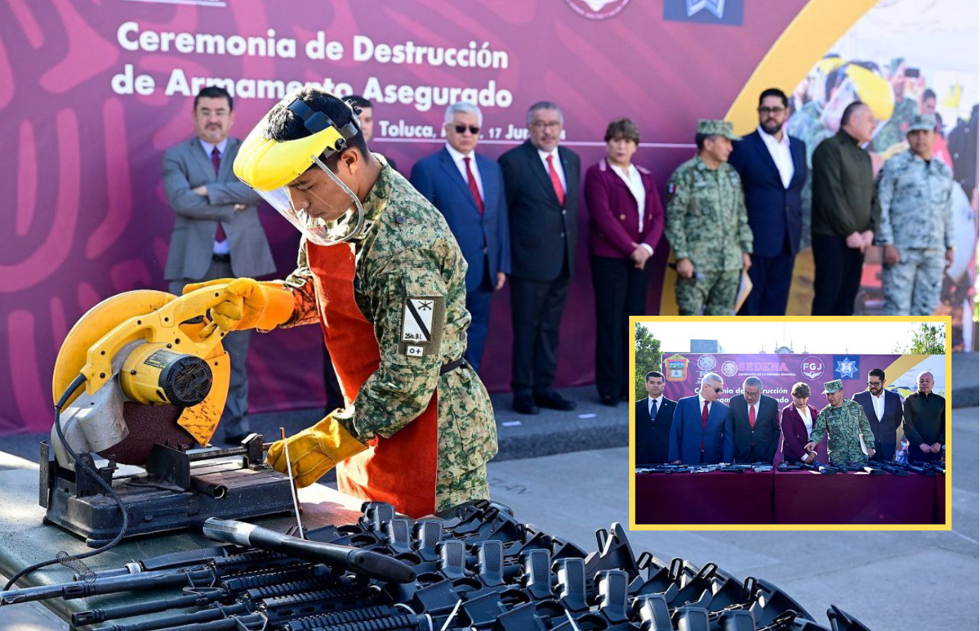 Al término de la ceremonia cívica en la Plaza de los Mártires, la Gobernadora Delfina Gómez Álvarez fue testigo de la destrucción de 54 armas cortas y 28 largas, las cuales fueron aseguradas por los tres órdenes de gobierno.