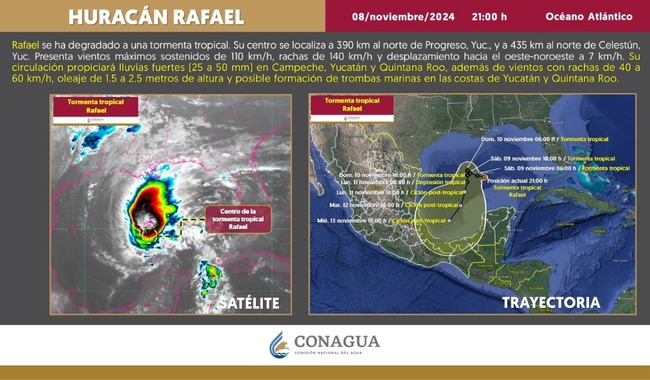 Hoy, 8 de noviembre, a las 21:00 horas, el huracán Rafael se degradó a tormenta tropical. Su centro se encuentra a 390 km al norte de Progreso, Yucatán, y a 435 km al norte de Celestún, Yucatán. Actualmente presenta vientos máximos sostenidos de 110 km/h, con rachas de hasta 140 km/h, y se desplaza hacia el oeste-noroeste a 7 km/h.