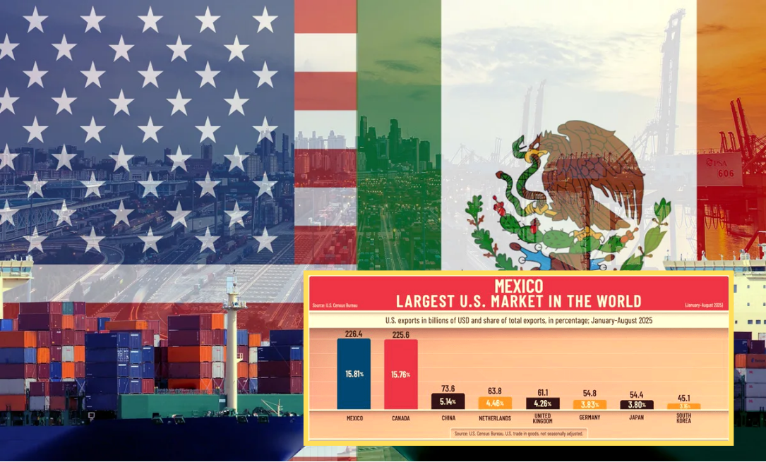 Regeneración, 21 de noviembre de 2025.– México escaló al primer lugar como destino de exportaciones de Estados Unidos. El país desplazó a Canadá, su tradicional socio histórico.