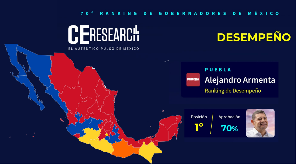 CE Research. 05 de enero 2026.– Alejandro Armenta, de Puebla, se estrena como el mejor gobernador de México por su trabajo según lo califican sus propios ciudadanos. El mandatario, quien tuvo una campaña publicitaria este mes con motivo de su informe de gobierno, es seguido de cerca por el priista Manolo Jiménez (2° lugar); el panista Mauricio Kuri (3° lugar); Libia García de Guanajuato (4° lugar); y Samuel García de Nuevo León (5° lugar).